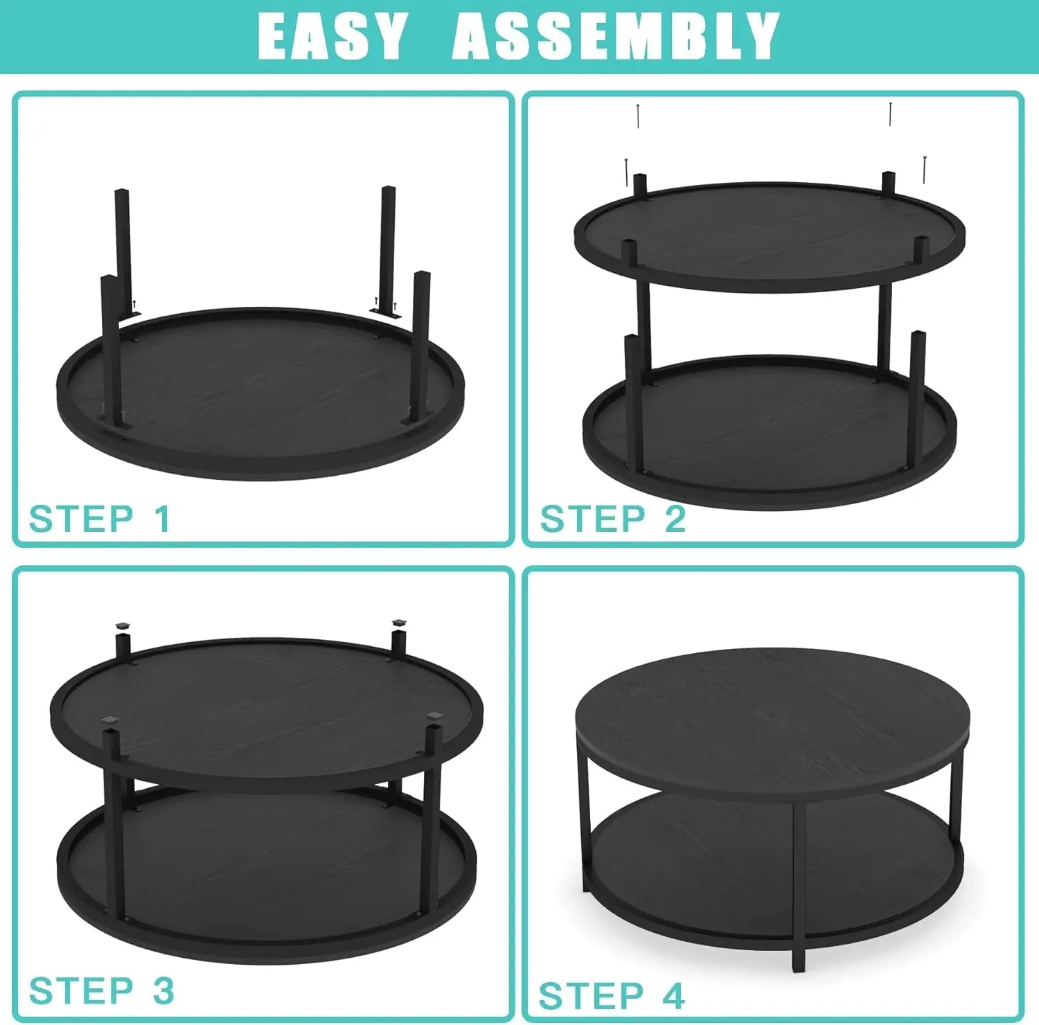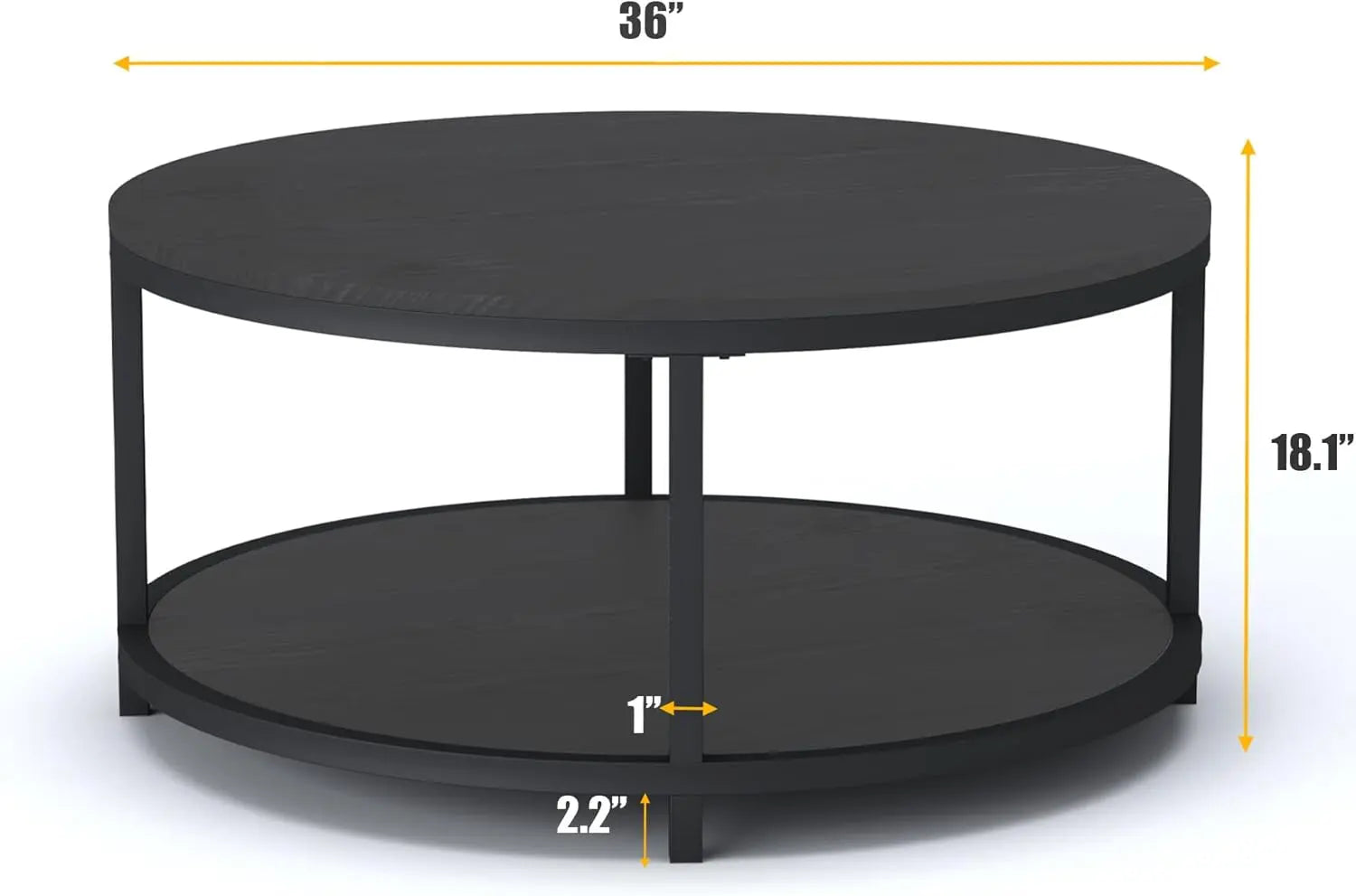 - [2-Tier Coffee Table]The round table top is 36 inch, which provides spacious space for living room supplies and keep your daily essentials nearby. The bottom shelf is 33.5", gives you extra space to store magazines and toys, and make your room tidy and neat.